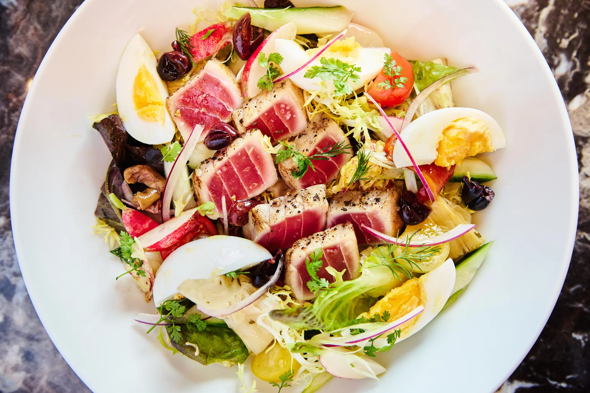 Mixed baby leaf salad, confit tuna, hard-boiled egg, artichokes, tomatoes, peppers, olives, spring onions, lemon olive oil